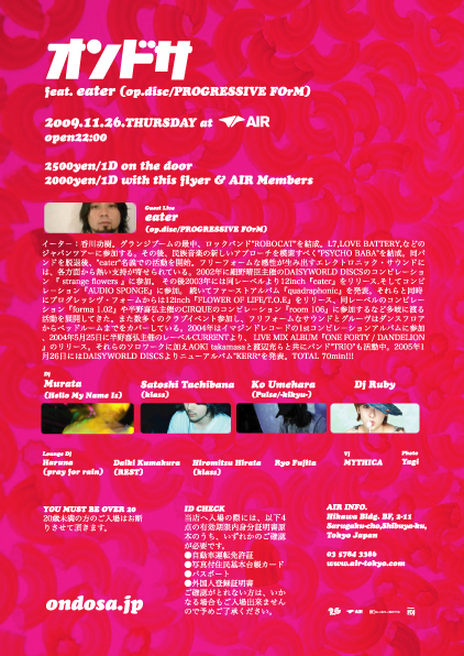 HIP HOPを中心としたブラックミュージックを音楽的ルーツに持ち、そこから派生した独自の解釈でダンスミュージックにアプローチし続けるDJ。ライブ感を重視したフィジカリティ溢れるDJスタイルと、ジャンルや形式の枠を好んで無視する前衛的なミックススタイルからは「野生」を感じさせる反面、メロディックな選曲で微妙な表情の変化をつけてゆく独自のミニマリズムからは「洗練」を感じさせる。この2つの要素を交錯させ構築してゆく温度のあるプレイは、今後も変化を恐れず進化し続け、ダンスミュージックのニュースタンダードを提案し続ける。