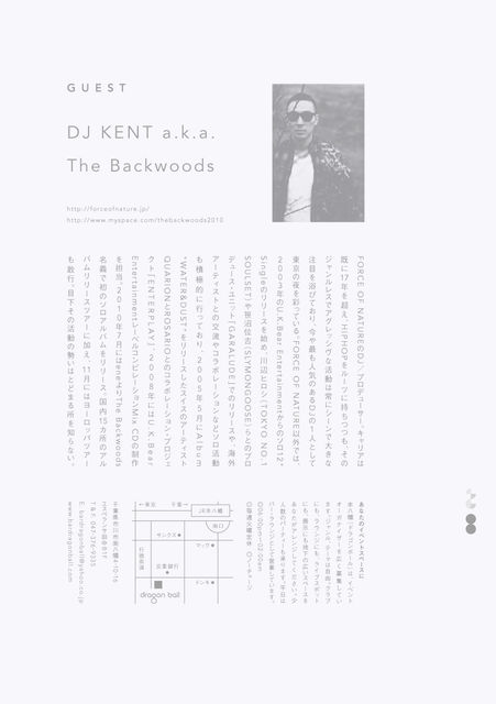 DJ KENT a.k.a. The Backwoods FORCE OF NATUREのDJ/プロデューサー。キャリアは既に17年を超え、HIPHOPをルーツに持ちつつも、そのジャンルレスでアグレッシヴな活動は常にシーンで大きな注目を浴びており、今や最も人気のあるDJの1人として東京の夜を彩っている。FORCE OF NATURE以外では、2003年のU.K.Bear Entertainmentからのソロ12" Singleのリリースを始め、川辺ヒロシ(TOKYO NO.1 SOULSET)や笹沼位吉(SLYMONGOOSE)らとのプロデュース・ユニット「GARALUDE」でのリリースや、海外アーティストとの交流やコラボレーションなどソロ活動も積極的に行っており、2005年5月にAlbum "WATER&DUST"をリリースしたスイスのアーティストQUARIONとROSARIOとのコラボレーション・プロジェクト「ENTERPLAY」、2008年にはU.K.Bear EntertainmentレーベルコンピレーションMix CDの制作を担当。2010年7月にはeneよりThe Backwoods名義で初のソロアルバムをリリース。国内15カ所のアルバムリリースツアーに加え、11月にはヨーロッパツアーも敢行。目下その活動の勢いはとどまる所を知らない。 http://forceofnature.jp/ http://www.myspace.com/thebackwoods2010