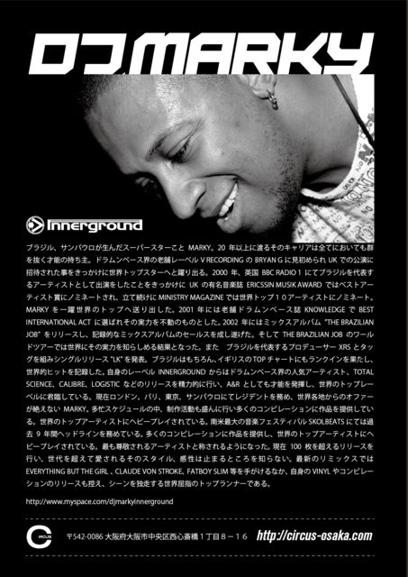 ブラジル、サンパウロが生んだスーパースターことMARKY。20年以上に渡るそのキャリアは全てにおいても群を抜く才能の持ち主。ドラムンベース界の老舗レーベルV RECORDINGのBRYAN Gに見初められUKでの公演に招待された事をきっかけに世界トップスターへと躍り出る。2000年、英国BBC RADIO 1にてブラジルを代表するアーティストとして出演をしたことをきっかけにUKの有名音楽誌ERICSSIN MUSIK AWARDではベストアーティスト賞にノミネートされ、立て続けにMINISTRY MAGAZINEでは世界トップ10アーティストにノミネート。MARKYを一躍世界のトップへ送り出した。2001年には老舗ドラムンベース誌KNOWLEDGEでBEST INTERNATIONAL ACTに選ばれその実力を不動のものとした。 2002年にはミックスアルバム"THE BRAZILIAN JOB"をリリースし、記録的なミックスアルバムのセールスを成し遂げた。そしてTHE BRAZILIAN JOBのワールドツアーでは世界にその実力を知らしめる結果となった。また ブラジルを代表するプロデューサーXRSとタッグを組みシングルリリース "LK"を発表。ブラジルはもちろん、イギリスのTOPチャートにもランクインを果たし、世界的ヒットを記録した。 自身のレーベルINNERGROUNDからはドラムンベース界の人気アーティスト、TOTAL SCIENCE、CALIBRE、LOGISTICなどのリリースを精力的に行い、A&Rとしても才能を発揮し、世界のトップレーベルに君臨している。現在ロンドン、パリ、東京、サンパウロにてレジデントを務め、世界各地からのオファーが絶えないMARKY。 多忙スケジュールの中、制作活動も盛んに行い多くのコンピレーションに作品を提供している。世界のトップアーティストにヘビープレイされている。 南米最大の音楽フェスティバルSKOLBEATSにては過去9年間ヘッドラインを務めている。 多くのコンピレーションに作品を提供し、世界のトップアーティストにヘビープレイされている。最も尊敬されるアーティストと称されるようになった。 現在100枚を超えるリリースを行い、世代を超えて愛されるそのスタイル、感性は止まるところを知らない。最新のリミックスではEVERYTHING BUT THE GIRL 、CLAUDE VON STROKE、FATBOY SLIM等を手がけるなか、自身のVINYLやコンピレーションのリリースも控え、シーンを独走する世界屈指のトップランナーである。