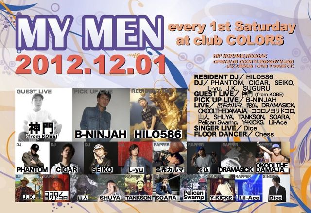 名古屋の第一土曜の夜を12年前からHOTにし続けて、名古屋のクラバーでは知らないものはいないほどの長寿イベント『MY MEN』 2012年ラスト12月のマイメンは、最新アルバム『上弦下弦』(11月14日発売)をリリースし、今日本で最も注目されているMC『神門』が登場!独自の世界観でオーディエンスを魅了し観客を感動と衝撃の渦に巻き込む彼のライブは必見!更には、伝説のグループ『B-NINJAH&AK-69』でもお馴染みのビーニンジャも駆けつける!このパーティーの主催者でもあり繊細かつダイナミックな選曲でフロアをコントロールする『DJ HILO586』、東海エリア屈指のパーティーロッカー『DJ PHANTOM』、切れ味抜群のスクラッチに幅広い選曲でフロアを変幻自在に操る『DJ CIGAR』、更には、SEIKO,L-yu,J.K.,など10年以上のキャリアをもつ実力派DJ陣が集結!2010年B-BOY Park MC Battle東海大会優勝、2011年アルティメットMC BATTLE東海代表『呂布カルマ』、「ULTIMATE MC BATTLE 2012」東海大会チャンピオン『CROWN-D』擁するHIP HOP集団『DRAMASICK』、オーディエンスを魅了する歌声と抜群の歌唱力を持つSINGER『Dice』、陀仏,OKOOLTHEDAMAJA,ココロノヨリドコロ,SHUYAらによるハイレベルなショーケースは、見れば必ず刺激を受けるハズ! 冬の寒さを吹き飛ばすHOTな内容でお届けしますので!12/1は是非是非<COLORS>へお越しください!!