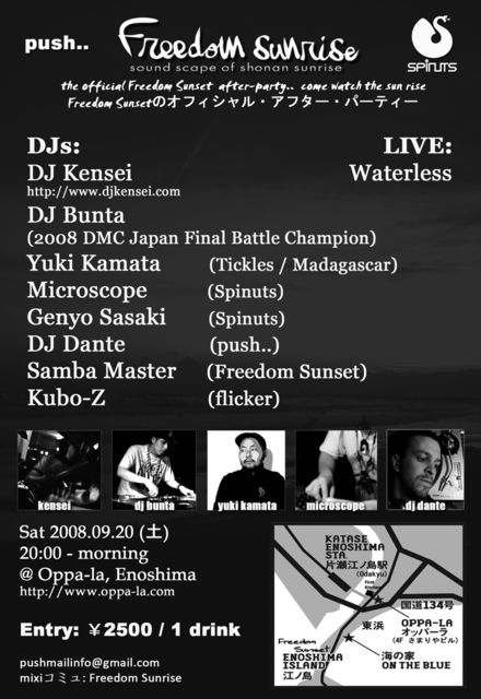 + DJ Dante (push..) http://www.myspace.com/djdantejapan 1999年、DJ Danteは故郷のUkでDJを始めた。そして2004年から、その活動基盤を日本に移し、push..のレジデントとして、そしてco- organiserとして日本でのダンスミュージックシーンを支えてきている。House、Breaks、そしてDiscoなどが複雑に絡み合う彼独自の スタイルで、誰しもがじっとしてはいられなくなる、最高にファンキーでソウルフルな夜をpresentできることになるでしょう。