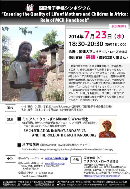 ■日時:2014年7月23日(水)18:30〜20:30(受付開始18:00) ■会場:国連大学(5F)エリザベス・ローズ会議場 (東京都渋谷区神宮前5-53-70) 渋谷駅から徒歩10分 地下鉄表参道駅出口B2(銀座線、半蔵門線、千代田線)から徒歩5分 http://archive.unu.edu/access/ ■使用言語:英語(通訳はありません) ■プログラム: 【進行】中村安秀(大阪大学教授/NPO法人HANDS代表理事/ 国際母子手帳委員会代表) 池上清子(日本大学大学院総合社会情報研究科 教授) 18:30-18:45 開会 18:45-19:05 ◆講演 「MCH Booklet in Kenya:Achieving Equity through the Lens of Universal Health Coverage」 杉下智彦氏(国際協力機構(JICA)保健分野課題アドバイザー) 19:05-19:55 ◆基調講演 「MCH SITUATION IN KENYA AND AFRICA AND THE ROLE OF THE MCH HANDBOOK」 ミリアム・ウェレ (Dr. Miriam K. Were) 博士 (第1回野口英世アフリカ賞受賞者/ケニア・ ウジマ財団共同創設者 /ケニアコミュニティヘルス戦略親善大使) 19:55-20:25 質疑応答 20:25-20:30 閉会 ------------------------------------------------------------------ ◎シンポジウム終了後に、懇親会を予定しています(事前申込要・有料) ------------------------------------------------------------------ ■主催: 国際母子手帳委員会 ■共催: UNICEF東京事務所 UNFPA東京事務所 特定非営利活動法人HANDS 厚生労働省科研費 「国連ミレニアム開発目標の達成に関する研究班」 ■後援: 国際開発学会 内閣府大臣官房野口英世アフリカ賞担当室 ■申込・問合せ: >> http://www.hands.or.jp/pagesj/00_whatsnew/mchh20140723.html
