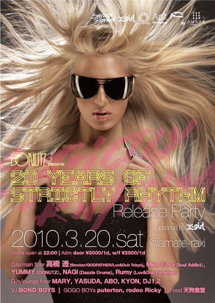 [PARTY DETAIL] 最強のハウスレーベル・Strictly Rhythmの20th anniversaryを祝して、amate raxi 3rd anniversaryを迎えお祝いムード満載の我がクラブから最高のパーティーピーポーへ贈る超スペシャルな一夜、それが題してDONUTZ presents "20 years of Strictly Rhythm Release Party"! 今回はパワフルな女性をコンセプトに、DJ YUMMY自らがプロデュースする、今話題のパーティー「DONUTZ」との共同開催。クラブカルチャーの歴史を語る上で欠かすことのできない、日本を代表する名ハウスマエストロ・高橋 透と、力強いプレイで現代の女性像を体現するYUMMYとの競演は、まさに歴史に残る一夜となること間違いなし。そこに加えてBARBARA TUCKERとの楽曲制作で注目を浴びるMiss Envy、Dazzle Drumsでの活躍も目覚ましいNagiという豪華キャストで、ハッピーな一夜にさらに華を添える。Loungeにはウッドストック生まれの音楽の申し子・MARYも登場! 音も仕事も、そしてもちろん恋もアグレッシブな現代女性を音楽でサポート! amate raxi×DONUTZ×20 years of Strictly Rhythm Release Partyの相乗効果で、忘れがたい最高の夜を… Check this out!!!