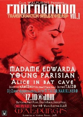 2011年ラストであると同時に、新たな展開の幕開けです。 この夜は、いよいよ始まるPROPAGANDAの第一夜。新進気鋭のアーティストたちを迎えてお届けするPROPAGANDA。その第一夜はTRANSFORMATIONの先駆者が登場! ライブアクトには、変幻自在のグラム才人TSUNEGLAM SAM率いる新世代グラムパンクの雄 YOUNG PARISIAN が降臨!さらに、性別や既存の枠組みを超えるTRANSFORMATIONの代名詞ZIN(Zinny)率いる進化形グラマラスポストパンクバンドMADAME EDWARDA に加え、関西からAlice in bat caveも登場! さらに、ゲストDJにnAo12xuを迎えます。もちろん、 毎回趣向を凝らした演出で話題のTAIZOによる真夜中の舞踏もご覧いただけます。