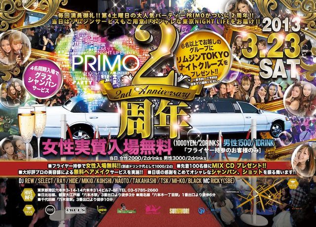 開催終了☆本日3/23(sat)@六本木HIVE~ "PRIMO"-2nd Anniversary☆