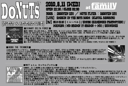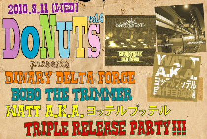 今回のDONUTSはどちらも待望過ぎる1st.ALBUMをリリースする2組を招集! これまで単独のリリースはないながらも圧倒的なパフォーマンスと堅実な活動で全国に「ヤバい」と噂を撒き散らしてきた藤沢が誇るDOPE HIP HOP集団【DINARY DELTA FORCE(※1)】に加え、過去の作品や現場での活動でそのクソアツいSTYLEを示し続けてきた漢…同業者からの信頼も厚いNatural Born EMCEE【BOBO THE TRIMMER(※2)】の2組がゲスト!!!!! “ついでに”WATTの新作(※3)も出たからっつって祝ってもらう便乗スタイル。 夏のド真ん中にアツさ200%増し…蒸し暑いのになぜか辛いもん食っちゃう感じで遊びに来てみてください!クラブは涼しいし。。。 迷ったら全ての出演者をもう一度見直すべし!!!