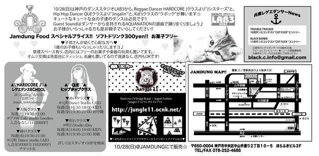 10/28(日)は、神戸のダンススタジオLAB3から、Reggae Dancer HARDCORE Jクラスより"Jシスターズ"と、Hip Hop Dancer QUEクラスより"Jingalin'"と、Kid'sクラスの"ラボック"が舞います☆