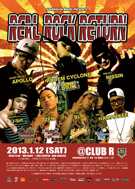 2013年一発目のREAL ROCK RETURNは… GUEST ARTISTに、キャリア約1年にして"ROAD TO REGGAE祭2008"に出場し本戦では惜しくも準決勝で終わったが、その後も連続出場し3度目の挑戦の末、遂に念願の優勝を果たした平成生まれ怪物【APOLLO】が!GUEST SOUNDには、SOUND CLASH "WAR GWAAN"で優勝経験を持ち、去年10周年を迎え2013年は更に勢いにのる大阪から発生した音の竜巻【RODEM CYCLONE】が登場!播州勢も【NISSIN】筆頭に、配信リリースを間近に控える【ZEN】、年末にJAMDUNGで行われたRUB A DUBバトルで優勝した【U-bit】などSOUND、DEEJAY共に間違いないメンツが集結!2013年一発目のREAL ROCK RETURNに来ないと今年一年が始まらない!1/12はCLUB Rに全員集合!!!!