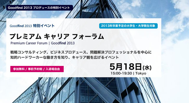 開催終了【5/18(水)・2013年卒学生向け・「Goodfindプレミアムキャリアフォーラム」】