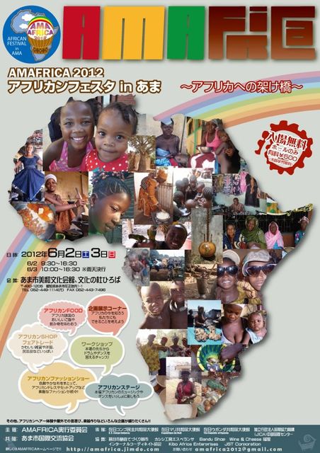 --------------------------------------------------------- 日時:2012年6月2日(土)9:30〜 オープニング 2012年6月3日(日)10:00〜16:30 ※雨天決行 会場:あま市美和文化会館、文化の杜ひろば 住所:愛知県あま市花正地1-1 主催:AMAFRICA実行委員会 共催:あま市国際交流協会 後援:在日コンゴ民主共和国大使館 D. R. Congo Embassy 在日マリ共和国大使館 Republique du Mali 在日ウガンダ共和国大使館 The Republic of Uganda JICA