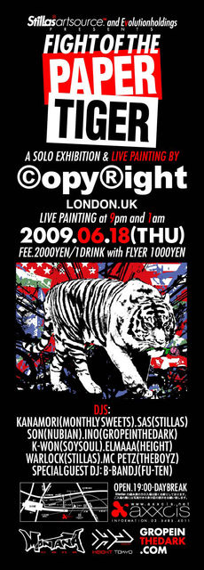 You are invited to the Opening Night of UK Artist Copyright's first solo exhibition in Asia at Club Axxcis in Tokyo, Japan on June 18th 2009. "Fight of The Paper Tiger" will feature 15 new works of art including an exclusive limited edition hand finished diptych print. Copyright's live painting session will be accompanied by guest DJs spinning into the wee hours of the morning. The exhibition runs through June 25th.