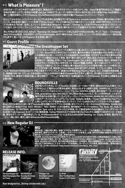 96年のオープンから今年で16周年を迎え、独自のカラーとそのクオリティーの高さから、Hip Hopの登竜門的存在として確固たる地位を築き上げている渋谷の老舗"club bar FAMILY"で、オープン当初から流行に流されることなく本物のHip Hopを提示し、第一土曜日を賑わしてきたPleasure。そんなPleasureが先日の14周年を機にPleasure+としてリニューアル!!