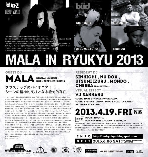 2012年もっともクラブシーンの話題をさらったアルバム-MALA IN CUBA-を引っさげUKダブステップのパイオニア、MALA(Digital Mystikz)の待望の再来沖公演が決定。 MALA IN CUBAはダブステップを超え、ジャイルスピーターソンプロデュースの元、クロスオーバーなサウンドとしても全世界が注目する作品。 リリース後初の来日!そしてなんと沖縄に来る!