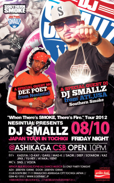 管理人様、告知失礼致します。 8/10 金 DJ SMALLZ JAPAN TOUR at Club South BBC 栃木 足利 「Lil’ Jon、Ludacris、そしてT.I. etc...と、アメリカ南部HIP HOPのパイオニア達と堂々コラボレーションを展開している、USはアトランタからSouthern Smokeこと「DJ SMALLZ」 がClub South BBCにて 8月10日 金曜日、出演決定!!」