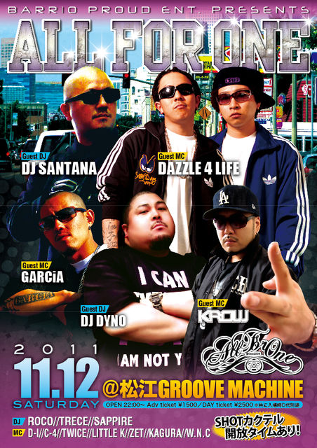 約半年ぶりとなるALL FOR ONE は二周年にふさわしい内容となりGROOVE MACHINE にもどり開催しますguestには広島よりCHIANO LIFE シリーズも絶好調なDJ SANTANA三重よりオリコンインディーズチャート二位を記録したのも記憶に新しいDAZZLE 4 LIFE,名古屋はDISCOTECAの率役者DJ DYNO,SONIA よりGARCIA,古くより広島のシーンを支えてる黒羽そして山陰west coastシーンを支える地元メンバーもパワーアップしたDJ やLIVE も乞うご期待!駐車場には地元LOWRIDER の車も並びシチュエーションもばっちりなので是非あそびにきてください ALL FOR ONE 11月12日(土) open /22:00〜 Adv ticket限定 1500yen day 2500yen 共にドリンク代別途 ★shotカクテル開放タイムあり