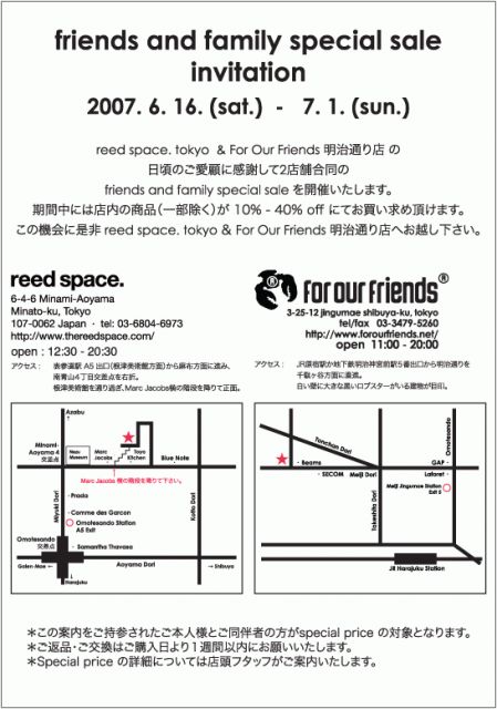 開催日:2007年6月16日(土)〜 7月1日(日) 開催店舗: reed space. tokyo 6-4-6 Minami-Aoyama Minato-ku, Tokyo 107-0062 tel/fax : 03-6804-6973 http://www.thereedspace.com/ open hours : 12:30 - 20:30