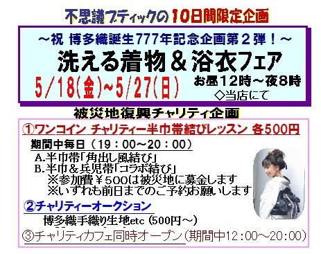 「Activities] ・Charity Obi Lesson・・・*one coin (500yen) each (A)Han-haba Obi lesson (B)Han-haba Obi &Heko-Obi lesson during 10days(18th~27th) from 19~20 reservation is requested by the previous day (reservation by phone is accepted)