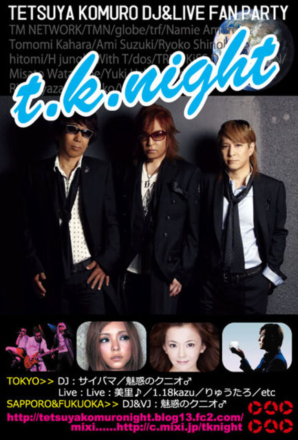 <作られたシステムと作り出すシステムのご紹介!!> ☆小室哲哉氏をフューチャーした、DJ PARTYです。 ☆小室さん楽曲オンリーで踊れる選曲!COME ON LET'S DANCE! ☆小室さん映像多数上映。君のいる夜にWhat you been-a doin'now? ☆小室さんグッズ展示OK。きっと今夜ここで会えるさ。 ☆小室さんクイズあり。教科書は何も教えてはくれない…。 ☆電話BOXに忘れたカセット募集。きっと今夜探し出せるさ。 ☆“t.k.night”オリジナルカクテル、 『RAINBOW RAINBOWカクテル』多数ご用意。 気軽にDrinkin'Drink It Much!君のKISSに夜がため息。 ☆Sexy Sexy君のくちびる!カラオケライブOK。 もしあの歌を君がまだ覚えていたら歌って下さい! ☆このままサヨナラをするわけにはいかない2次会完備。 今夜は朝まで気軽にBE TOGETHER。 疲れた目に見えるのは上がりかけた太陽のグラデーション!