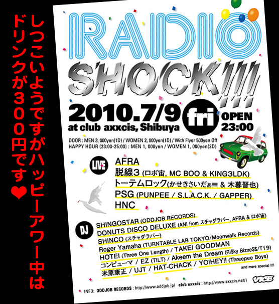 -DJ- SHINGOSTAR (ODDJOB RECORDS) DONUTS DISCO DELUXE (ANI from スチャダラパー, AFRA & ロボ宙) SHINCO (スチャダラパー) Roger Yamaha (TURNTABLE LAB TOKYO/Moonwalk Records) HOTEI (Three One Length) TAKEI GOODMAN EZ (TILT) Akeem the Dream (Ri$ky Bizne$$/T19) 米原康正 UJT Threepee Boys and more special l!!!