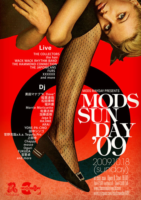 MODS MAYDAY PRESENTS MODS SUNDAY '09 2009.10.18 (sunday) Open & Start 16:00 Adv.¥2500 (D別) Door¥3500 (1d) <Live> THE COLLECTORS / the hair / WACK WACK RHYTHM BAND / THE HAMMOND CONNECTION / THE JAPONICANS / FURS and more <Dj> 黒田マナブ"K. Dove"/稲葉達哉/松田憲明/堀井康/Morrie Morissette,/佐藤志朗/加藤直樹/Jaga b/HAJIME/ARAI/YONE-PA-CINO/田中シンゴ/菅野克哉a.k.a.Tequila Pro/上田歩/Chappy/mosse/Oguri/FUKUDA/宮里卓 and more