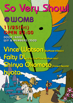 11月のSo Very Showは、Vince Watsonが登場!疾走感漲るリズムに、叙情的でメランコリックなシンセ・ワークで、スケール感の大きな繊細なアルペジオ・シンセが軽やかに浮かび上がってくる楽曲はデトロイトフォロアーの中でも際立っており、テクノ、テックハウス界におけるプロデューサー、Liveパフォーマーとして確固たるスタンスを確立している。その活動歴は長く、1988年の活動スタート以来、PlanetE、Delsin、Ibadanなど数々のレーベルからリリースを重ね、傑作を数多く残してきた。 共演は、寿司職人という異色の経歴を持つAndrew Cyrus LustmanによるソロプロジェクトFalty DL。09年、Planet Muよりアルバム”Love Is A Liability”をリリースし、Rush HourやHotflush Recordingsなどの前衛レーベルからもリリースを続ける。ダブステップ、テクノ、ハウスおよびガレージ音楽を絶妙に取り入れた彼のプレイは聞き逃せません。どうぞお楽しみに!