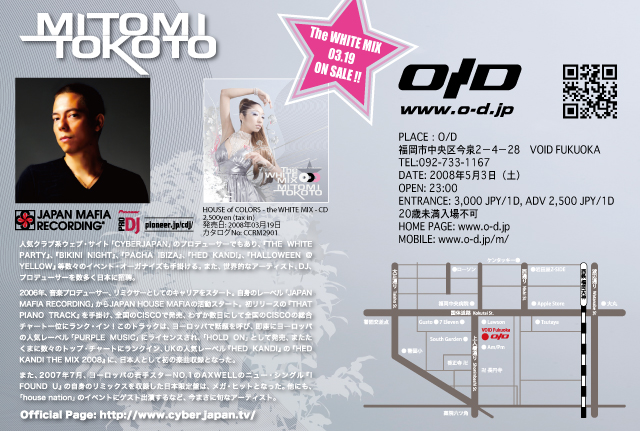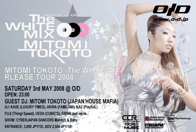 ダンサブル&スパークルな、アッパー・チューンをつめこんだ MITOMI TOKOTO 初のミックスCD発売を記念して、福岡を代表するクラブ O/D にMITOMI TOKOTO が初登場。オリジナルトラックはもちろん、メジャー音源のみをつめこんだ the WHITE MIX の収録曲から、最新のヒットトラックまでフルにプレイ。