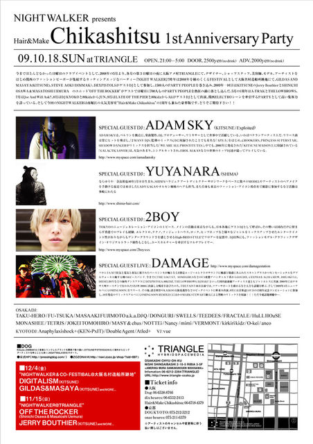 ■NIGHT WALKER PARTY INFO 今までほとんどなかった日曜日のクラブイベントとして、2008年の5月より、各月の第3日曜日の夜に大阪アメ村TRIANGLEにて、デザイナー、ショップスタッフ、美容師、モデル、アーティストをはじめ関西のファッションピーポーが集結するカッティングエッジなパーティー『NIGHT WALKER』!! 昨年は2008年を締めくくるFESTIVALとして大阪名村造船所跡地にて、GILDAS AND MASAYA(KITSUNE)、STEVE AOKI(DIMMAK)、DEXPISTOLSがゲストDJとして参加し、1500人のPARTY PEOPLEを巻き込み、2009年一回目はKITSUNEのJerry BouthierとSHINICHI OSAWA & MASATOSHI UEMURA のユニット"OFF THE ROCKER" がゲストで日曜日に700人ものPARTY PEOPLEを熱狂の渦に落とし込んだ。 5月の1周年はA-TRAKとTHE LOWBROWS、7月はJoe And Will Ask?、8月はDJ KYOKOと80kidzからJUN、9月はLATE OF THE PIERと80kidzからAliがゲストDJとして出演、関西ELECTROシーンを牽引するPARTYとして高い集客力を誇っている。 そして今回のNIGHTWALKERは南堀江の人気美容室“Hair&Make Chikashitsu”の1周年も兼ねた豪華版です。どうぞご期待下さい!!