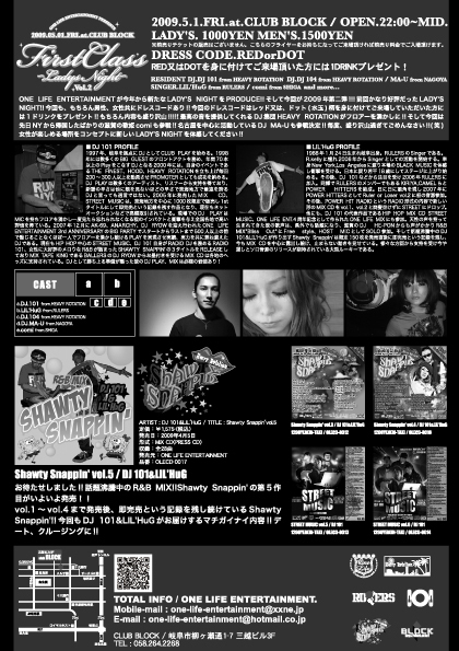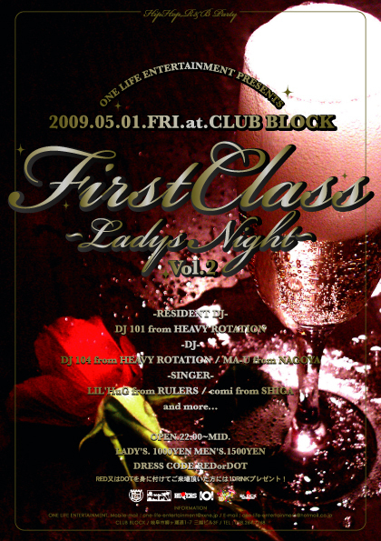 2009.05.01(fri)"First Class"at 岐阜CLUB BLOCK ONE LIFE ENTERTAINMENT 5th Anniversary Year PARTY!! START/PM 10:00(22:00)~MID 岐阜市柳ヶ瀬通1-7 三越ビル3F