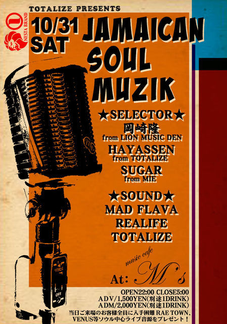 第2回目のJAMAICAN SOUL MUZIKはなんとびっくり!LION MUSIC DENオーナー岡崎隆が登場!滅多に聴けない岡崎隆のソウルセレクションが解禁!このJAMAICAN SOULのプロモーターでもあるHAYASSEN from TOTALIZE!MIXCDでお馴染みのJAMACAN SOUL MUZIKは要チェック♪ 岐阜のファンデーションサウンドMAD FLAVA 、STAMINA RECORDSでお馴染みのREALIFE、そしてTOTALIZE with JABBA.O-GEN.KEN-TURE&MANAVIN このメンバー最高の夜になること間違いなし。これからJAMAICAN SOULをプレイしたいセレクター、サウンドはもちろん、MUSIC LOVERSは要チェック!大人の方でも安心して楽しめるプログラムになってます。みなさん是非遊びに来てください★