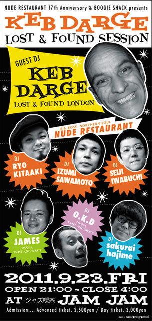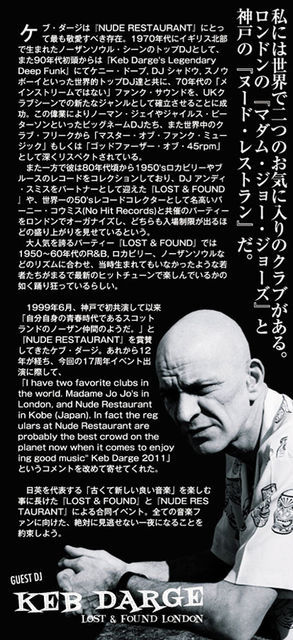 「I have two favorite clubs in the world. Madame Jo Jo's in London, and Nude Restaurant in Kobe (Japan). In fact the regulars at Nude Restaurant are probably the best crowd on the planet now when it comes to enjoying good music Keb Darge 2011」 というコメントを改めて寄せてくれた。