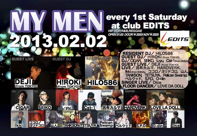 毎月第一土曜日!満員御礼!名古屋のクラバーでは知らないものはいないほどの長寿イベント『MY MEN』 143回目の今回は、2005年 「UMB」第1回グランドチャンピオン大会にてベスト8、2006年に1stアルバム「SENBE-BUTON」を発売して以来、ソロマイカーとしてコンスタントにリリース/客演を重ね、また数多くのイベントでのライブやMCバトルへのエントリーなど現場レベルでも活躍を続けている『DEJI』、東京を中心に数々のイベントでプレイし10年以上に渡る現場での経験によって磨かれたスキルとセンス、そしてHip Hopに対する情熱で多くのハードコアな同業者達からも熱い支持を集める『DJ H!ROKi』らがゲストで駆けつける! そしてこのパーティーの主催者でもあり繊細かつダイナミックな選曲でフロアをコントロールする『DJ HILO586』、切れ味抜群のスクラッチに幅広い選曲でフロアを変幻自在に操る『DJ CIGAR』、更には、SEIKO,L-yuなど10年以上のキャリアをもつ実力派DJ陣が集結!2010年B-BOY Park MC Battle東海大会優勝、2011.2012年二年連続アルティメットMC BATTLE東海代表『呂布カルマ』、「ULTIMATE MC BATTLE 2012」岐阜大会チャンピオン『HARDVERK』、オーディエンスを魅了する歌声と抜群の歌唱力を持つSINGER『Dice』、近畿東部注目のアーティスト『IkkI』『Dj Cst-1』らも緊急参戦!ココロノヨリドコロ,山人,TANKSON,TETSUYA,らによるハイレベルなショーケースは、見れば必ず刺激を受けるハズ! ※2月のマイメンはCOLORSではなく『EDITS』で開催しますのでご注意ください。