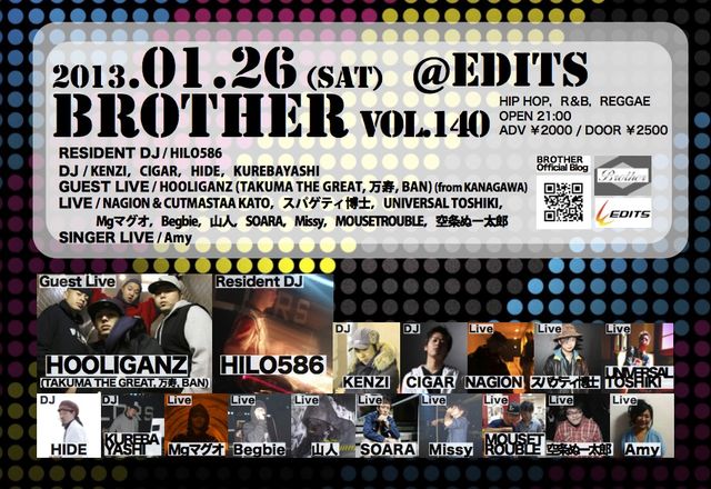 1月26日(土) BROTHER vol.140 @EDITS HIP HOP,R&B,REGGAE OPEN 21:00/DOOR ¥2500/ADV ¥2000