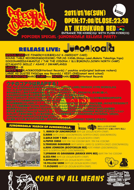 TAK THE CODONAのINDEPENDENT HIPHOP LABEL「BRIKICKHYPE WORKS」からFUNKYかつFREAKYなFLOWを持つコアラ!JUNONKOALAが2011/01/05 1ST ALBUM「MARCH OF JUNONKOALA」RELEASE!!本作は自身のここ数年での楽曲を収録し、BEATの上をFUNKYに、荒く、FREAKYに、また時に優しく、大きなBRESSの後に様々な表情と独特の間、リズム解釈と共に言葉を吐き出す。FUNKYなBEATや、SMOKYなBEAT、MELLOWなBEATと、様々なBEATをのりこなす様は自由なHIPHOPを表現するアメリカ西海岸UNDERGROUND MCのようだ。本作の援護射撃にはLABELオーナーのTAK THE CODONAがFEATURING、TRACK提供、JACKETDESIGNにて参加。また今話題沸騰の「DOWN NORTH CAMP」からQXがALBUMの大半をPRODUCE。地元群馬からはDNA、OFFWHYTE(GARAPAGOS4)をFEATURINGした12INCH SINGLEが話題の世界水準の覆面BEATMAKER「MANTLE」そして2008年にCANADA「GRANMA MUSIC」のコンピレーションALBUM参加が話題になった事が記憶に新しい上州暗黒の煙「DIXIONAREEDS」からYARMA、ORIZO。(先日リリースされたMANTLEの12INCHでもDIXIONAREEDSとして参加) JUNONKOALAのMARCHはまだ始まったばかり。日々更新。日々行進。皆の心の平和を願い、群馬SAFARI PARKからHONKEY TONKY CRAZY!