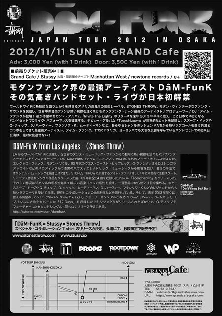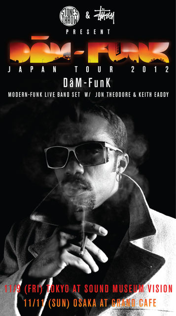 LAからワールドワイドに活躍し、全世界のダンス・ミュージック・ファンがその動向に熱い視線を注ぐモダンファンク・アーティスト/プロデューサー/DJ、DâM-FunK(デイム・ファンク)。彼は80年代のブギー・ディスコをはじめ、エレクトロ・ファンク、モダン・ソウル、90年代のウエストコースト・ヒップヒップ、G-ファンク、さらにはシカゴやデトロイトなどのメロディックかつ漆黒のハウス/エレクトリック・ミュージックから影響を受け、独自の手法でオリジナル・ミュージックを築き上げてきた。STONES THROWに所属するデイム・ファンクは、07年に本格的に活動スタート。リミックス作品やシングル作品をリリースした後、09年に全24曲を収録したアルバム『Toeachizown』をリリースした。それらの作品はジャンルの垣根を越えて幅広い音楽ファンの感性を捉え、一躍世界中から熱い注目を集める。また、スヌープ・ドッグやQ-ティップ、DJクイック、ムーディーマン、DJハーヴィー、フランソワ・Kなどのレジェンドからも熱いラブコールを受けて共演。現在もコラボレーションの楽曲制作などを進行している。そして、来年2013年早々に控える待望のセカンド・アルバム『Invite The Light』から、リードシングルとなる「I Don’t Wanna Be A Star!」とプリンスの名曲をカバーした「17 Days」を収録したマキシシングルがリリースされたばかりで、Q-ティップをフィーチャーしたセカンドシングルも間もなくリリース予定である。