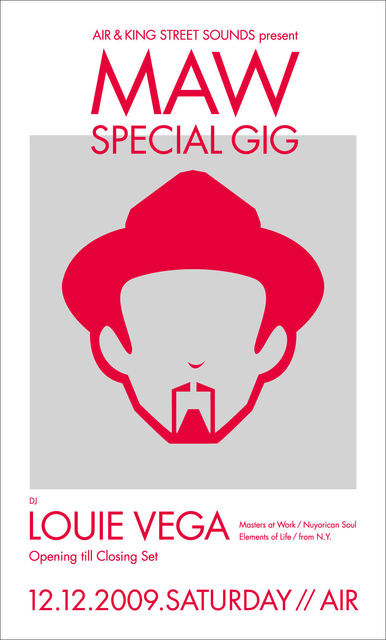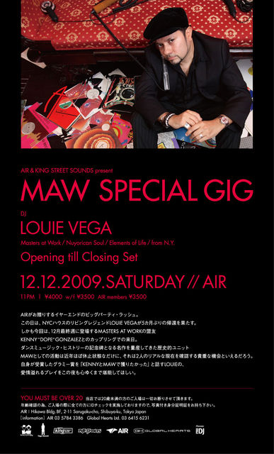 12/12(SAT) @ AIR AIR & KING STREET SOUNDS present MAW SPECIAL GIG Guest DJ: LOUIE VEGA(Masters at Work / Nuyorican Soul / Elements of Life) Open: 23:00 -OPENING TILL CLOSING SET- ADM: Door/4000yen, With Flyer/3500yen, AIR MEMBERS/3500yen (このフライヤー画像をプリントアウトしてもWith Flyer/3,500yenとしてご入場いただけます) *20歳未満の方のご入場はお断りさせていただきます。入場の際には身分証明書のご提示ください。