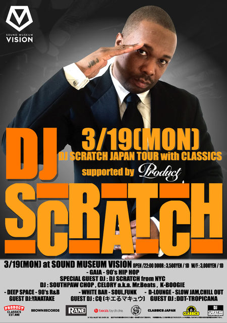 DJ Scratchはfavorite DJとして約20年以上この音楽業界に君臨している。 オールタイム・グレイテストDJであり、2006年には、Source MagazineのHIPHOPアイコン に選ばれた。Scratchは、EPMD、Jay-Z、P DiddyのバックDJとしてシーンを支え続けてき た。ここ何十年もの間、EPMDと共にオーディエンスを湧かせ続け、また彼の有名なDJルー ティーンは、Big Daddy Kaneの"Friday the 13th Imma Play Jason"のパートで、ホッ ケーマスク(ジェイソンマスク)を被ってオーディエンスを湧かせる事だ。15年以上、様々な DJルーティーンとトリックのみで活躍しているのは彼だけであろう。 DJ Scratchは最もリスペクトされている、エキシビション、ツアー、クラブDJである。 1988年 New Music Seminar Battle for World Supremacy DJ Championshipで優勝 した後、RUN DMCのRun's House World Tourに参加。Jam Master Jayと親交を深め、 その後のツアーのパフォーマンスはScratchに一任したほどであった。ScratchはJMJに対し、 RUN DMCのライブで必要なスキルを全て教え、その見返りとしてJMJは、当時バックDJを 探していたEPMDをScratchに紹介。後は歴史の通りである。 Scratchは、Hip Hop Hold Em、Uptown Comedy Club、B.E.T.のRap City, The Basementといった歴史的HIPHOP番組での音楽担当を任せられるまでとなった。また、 Juice、The Original 50 Cent、Backstage、Fly By Night、Rhyme & Reason、Spike LeeのBamboozledといった映画にも音楽を提供し、彼の名前が一般的に知られるきっかけ となった、コカコーラのコマーシャルをプロデュース、出演を果たしている。 DJマスターの称号を得たScratchは、次第にプロデュース作業に没頭するようになる。NYア ンセムのNY Shit、Rampage、Ill Bomb、50 Shot Ya等のHIPHOPクラシックスを次々とプ ロデュース。これらは現在でもフロアーを湧かせ続けている。その功績は、グラミーにノミ ネートされ、40ものゴールドもしくはプラチナムディスクを獲得。DJ Scratchがクレジットさ れているレコードは三千万枚売れているという。 若いDJに対し、Scratchは「両足を動かす前に腕を動かせ」と教える。それは時間が許す限 り、ミックスやブレンドの基本技術を叩きこみ、その後スクラッチやカットをしなさいという彼な りの教えである。 「DJを始める全てのDJに捧げる、Scratchを見習え」と言われているほどのDJマスターは、 決して驕る事なく今日も練習に励んでいる。