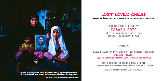 スナイ・プァスク:ヒューマン・ライツ・ウオッチ(アジア) ーーーーーーーーーーーーーーーーーーーーーーーーーーーーーーーーーーーーーーー FCCT アート/フォトギャラリー 後藤勝写真展 “Lost Loved Ones: Portraits from the Deep South into the Red Zone” 写真展期間:11月5日〜28日/月曜〜金曜日/午前10時〜午後11時 ーーーーーーーーーーーーーーーーーーーーーーーーーーーーーーーーーーーーーーー FCCTは後藤勝の写真展を開催します。2004年から、「レッド・ゾーン」と呼ばれる、武装化された仏教徒とイスラム教徒の村々を取材しました。このタイ最南部地域では、2004年以来3000人を超す民衆が殺され、今もなお仏教徒とイスラム教徒が隣り合わせで生活しています。 この抗争は地域のイスラム・仏教徒双方の人々の生活全てに影響を及しました。 この写真展では最愛の家族を失った人々を撮影したポートレイト・シリーズが展示されます。