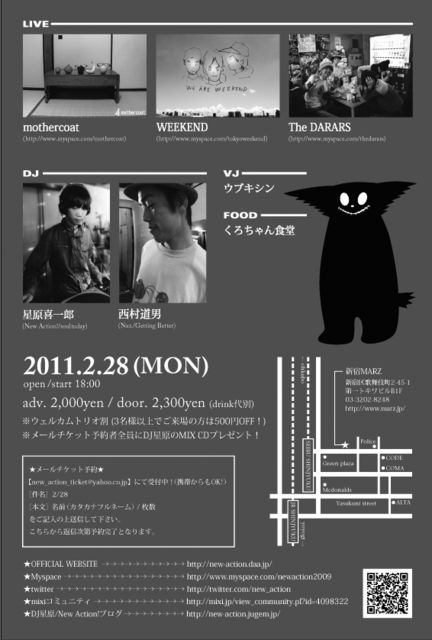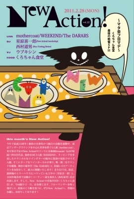 ■ about New Action! ■ ブルーマンデーをハッピーマンデーに!週頭から盛り上げたって良いじゃないか!という若気の勢いに任せたまま、毎月最終月曜日に開催している New Action!これから花が咲くであろう若手アーティストや、もっと多くの人たちに知ってもらいたいインディーアーティストを、DJ星原喜一郎を通して、あらゆる音楽ファンへ向けて発信していくウルトラスーパーフレッシュネスパーティー。