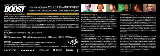 2007年より「REBOOT」のAFTER HOURS PARTYとしてスタートし、今や東京の最重要AFTER HOURS PARTYの一つとなった「BOOST」が4周年と共に幕を閉じます!