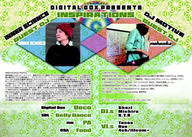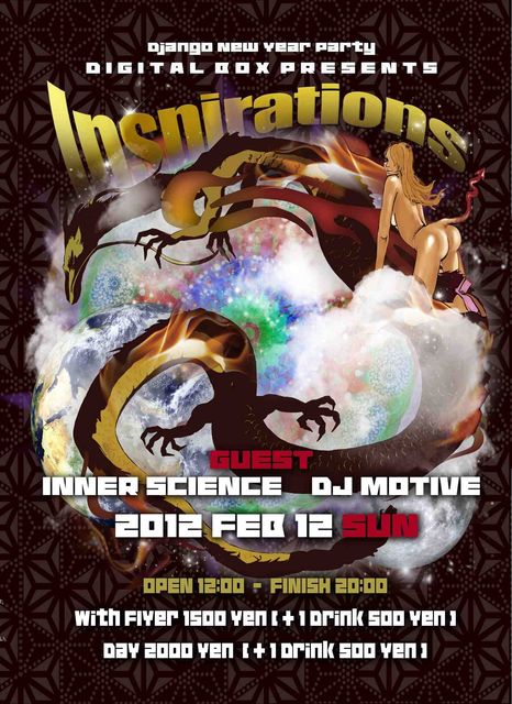 2012.2.12.SUN @DJANGO(岐阜県中津川市千旦林広沢177-14)TEL0573-68-4611 DJANGO New Year Party Digital Box present Inspirations Open12:00 Finish20:00 With Flyer1500yen(+1Drink500yen) Day2000yen(+1Drink500yen) ☆Guest DJ.s☆ Inner Science Dj Motive