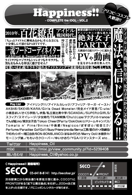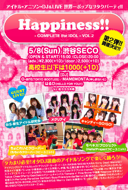PLAY LIST: アイドリング!!!/アイドルカレッジ/アフィリア・サーガ・イースト/AKB48/SKE48/KARA/Girls Dead Monster/完全メイド宣言/℃-ute/小桃音まい/さくら学院/しず風/私立恵比寿中学/SCANDAL/SUPER☆GIRLS/スフィア/スマイレージ/少女時代/TEAM純情/Chu!☆Lips/テクプリ/d-trance/でんぱ組.inc/東京女子流/Tokyo Cheer2 Party/DokiDoki☆ドリームキャンパス/Tomato n' Pine/9nine/中島愛/Negicco/ぱすぽ☆/初音ミク/Perfume/Paradise Go!! Go!!/Buzy/Priere/pre-dia/Berryz工房/星のオトメ歌劇団/THEポッシボー/堀江由衣/BON-BON BLANCO/まなみのりさ/Marry Doll/水樹奈々/モーニング娘。/ももいろクローバー/ゆいかおり/YGA/ロマンスターズ etc...