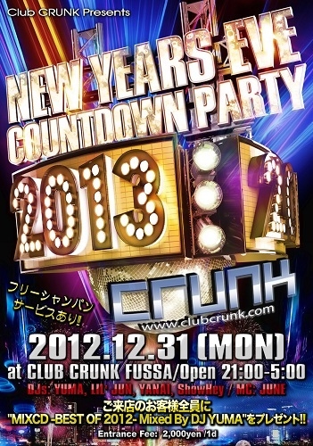 CLUB CRUNK 福生にて、毎年行われている"NEW YEARS COUNT DOWN PARTY"!! 今年も12月31日開催決定!! ご来店されたすべてのお客様にCLUB CRUNKから"MIXCD BEST OF 2012" -Mixed by DJ YUMA-をプレゼント!!完全非売品のこのCDは必聴です!! 今年一年、日頃の感謝を込めてスタッフ一同心からのご来店お待ちしております。