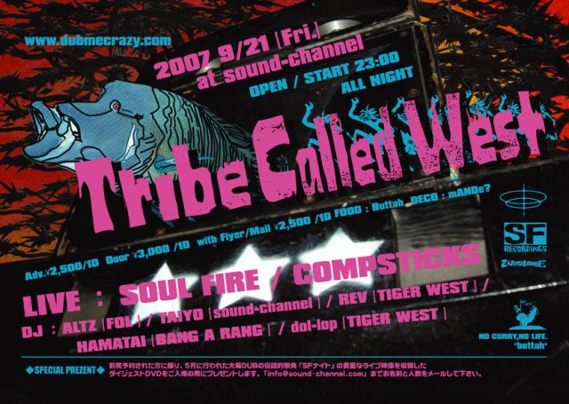 「Tribe Called West」 大阪DUBの源流SOUL FIREの本格的な活動開始から早12年。 大阪DUBと呼ばれるその潮流はゆっくりと深く深く染み渡り、新たな未曾有の地下水脈と合流し続ける。 ソウルファイアとコンプスティックスの07年最新音源をsound-channelを主催するTAIYOとFLOWER OF LIFEの代表的アーティストALTZがそれぞれREMIXしコンパイルしたEP、「Tribe Called West EP vol.1」は関西DUBの真髄と進化を凝縮した記念すべき12インチ・レコードであり、今回はあらゆるパーティー・シーンが融合・進化を繰り返す大阪でも、SF Recordings×sound-channel×FOLという未曾有の方程式による奇跡的なラインナップが実現。キラー・80'sセレクターとして名を馳せるHAMATAIや、REVとdol-lopによる話題のパーティー・クルー「TIGER WEST」も登場し、唯一無二の夜を起爆させること間違いなし! このウネリは大阪でしか味わえません。 http://www.westribe.net/