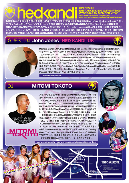 レジデント DJ として、「HED KANDI 2008: THE MIX」に、日本人初のトラック収録となった MITOMI TOKOTO が共演。KANDI GO-GO DANCERS 達のショーと、キラキラ華やかさ満点の夜を踊り明かそう!