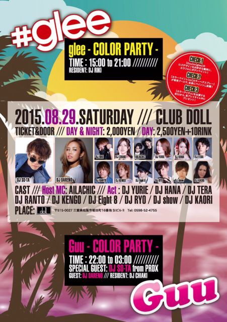 Resident DJ RIKI ーーーーーーーーーーーーーーー Guu【NIGHT】 ~COLOR PARTY~ 8.29(SAT) Place:CLUB doll Time:22:00 to 03:00 [LADIES / MEN] Ticket:\2000 [DAY] Door:\2500+1Drink Guest DJ SO-TA from PRDX DJ DARENO Resident DJ CHIAKI ーーーーーーーーーーーーーーー 【CAST】 Host MC AILACHIC Act DJ YURIE DJ HANA DJ TERA DJ RANTO DJ KENGO DJ Eight 8 DJ RYO DJ show DJ KAORI