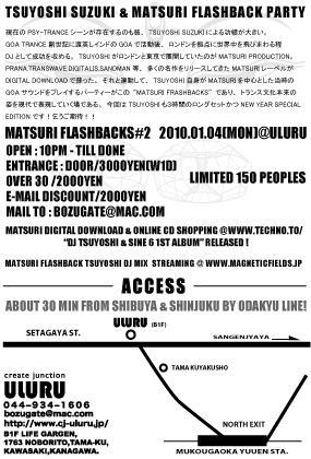 MATSURI FLASHBACKS#2 ‐The Happy New Year To Come Back To The Source- 2010/01/04(MON) OPEN : 22:00-TILLDONE ENTRANCE:DOOR/3000YEN(W1D) OVER 30/2000YEN E-MAIL DISCOUNT/2000YEN MAIL TO : bozugate@mac.com