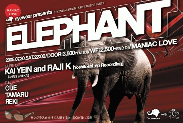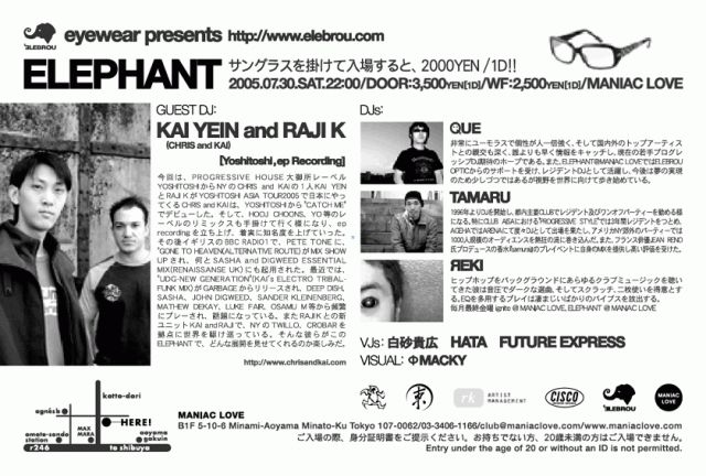 今回は、PROGRESSIVEHOUSE大御所レーベルYOSHITOSHIからNYのCHRIS and KAI の1人KAI YEINとRAJI KがYOSHITOSHI ASIA TOUR2005で日本に やってくる。 CHRIS and KAIは、YOSHITOSHIから"CATCH ME"でデビューした。そして、HOOJ CHOONS、YO等のレーベルのリミ ックスも手掛けて行く様になり、ep recordingを立ち上げ、着実に知名度を上げていった。その後イギリスのBBC RADIO1で 、PETE TONEに、"GONE TO HEAVEN(ALTERNATIVE ROUTE)がMIX SHOW UP され、何とSASHA and DIGWEED ESSENTIAL MIX(RENAISSANSEUK)にも起用された。最近では、"UDG-NEWGENERATION"(KAI'sELECTROTRIBAL-FUNKMIX)がGARBAGEからリリースされ、DEEPDISH、SASHA、JOHNDIGWEED 、SANDER KLEINENBERG、MATHEW DEKAY、LUKE FAIR、OSAMU M等 から頻繁にプレーされ、話題になっている。またRAJIKとの新ユニットKAI and RAJIで、NYのTWILLO、CROBARを拠点に世界を駆け巡っている。そんな彼らがこのELEPHANTで、どんな展開を 見せてくれるのか楽しみだ。