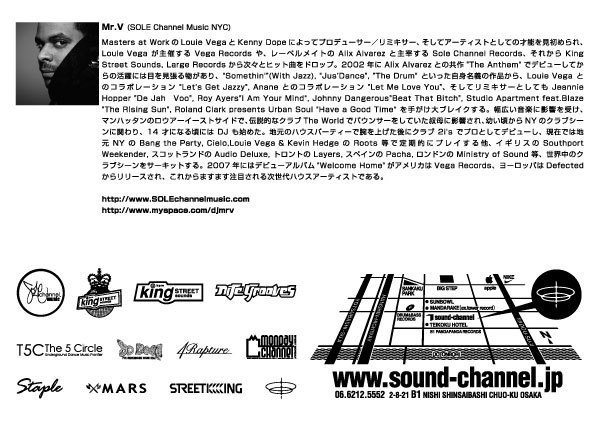 Mr.V... Masters at WorkのLouie VegaとKenny Dopeによってアーティストとしての才能を見初められ、Louie Vegaが主催するVega Recordsや, レーベルメイトのAlix Alvarezと主宰するSole Channel Records、それからKing Street Sounds, Nite Grooves, Large Recordsから次々とヒット曲を量産するMr.V。 2002年にAlix Alvarezとの共作”The Anthem”でデビューしてからの活躍には目を見張る物があり、”Somethin’”(With Jazz), “Jus’Dance”, “The Drum”といった自身名義の作品から、Louie Vegaとのコラボレーション”Let’s Get Jazzy”, Ananeとのコラボレーション”Let Me Love You”、そしてリミキサーとしてもJeannie Hopper “De Jah Voo” , Roy Ayers “I Am Your Mind”, Johnny Dangerous “Beat That Bitch”, Studio Apartment feat. Blaze “The Rising Sun”, Roland Clark presents Urban Soul “Have a Good Time”を手がけ大ブレイクする。 ディープハウス、ガラージ、ラテンからヒップホップ、ディスコクラシックス、R&Bからジャズに至るまでの幅広い音楽に影響を受けたと語るMr. V。 マンハッタンのロウアーイーストサイド出身で、伝説的なクラブThe Worldでバウンサーをしていた叔母に影響され、幼い頃からNYのクラブシーンに馴染みのあったMr. V。 14才になる頃にはDJも始めた。 地元のハウスパーティーで腕を上げた後にクラブ2i’sでプロとしてデビューし、現在では地元NYのBang the Party, Cielo, Louie Vega &? Kevin Hedge のRoots 等で定期的にプレイする他、イギリスのSouthport Weekender, スコットランドのAudio Deluxe,? トロントのLayers, スペインのPacha, ロンドンのMinistry of Sound等、世界中のクラブシーンをサーキットする。 2007年にはデビューアルバム”Welcome Home”がアメリカはVega Records、ヨーロッパはDefectedからリリースされる。 今年に入ってからも、”Tales From The Deepside EP”や、”Butterflies” Traxsourceで長期に渡り大ヒットを記録したりと、ハウスシーンで現在最も勢いのあるDJ/アーティスト/プロデューサー/リミキサーである。 --------------------------------------------