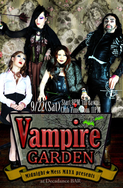 Hosted by Mistress MAYA, ADRIEN Vampire Bartendar: PORCO & TBA Floor/Door: VAMPIRE FAMILY FETISH/Rope Bondage by Vampire Mistress MAYA GUEST DJ: DJ FRED The BAT(NUIT ELASTIQU/NUIT DEMONIA) from France VAMPIRE DJ: MistressMAYA/STATIK/FRANCOIS/Ray Trak/Sabbat666/皐月 BOOTH: FANG SHOP by SUMIO