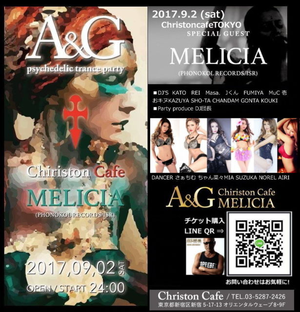 開催終了9月2日(土)新宿キリストンカフェTOKYO A&G psychedelic trance party MELICIA 来日!!!!